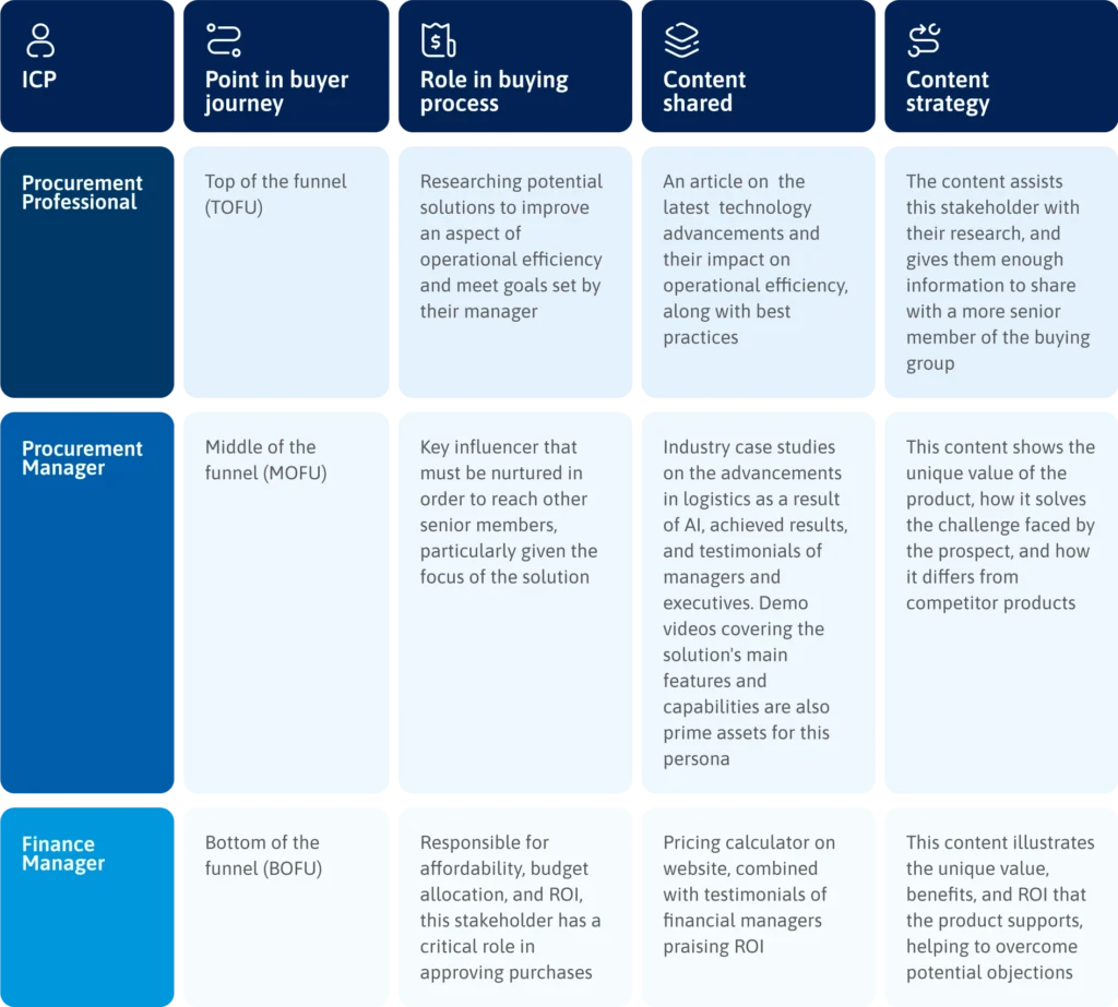 Below is an example of how content can be used to engage various members of a buying group.